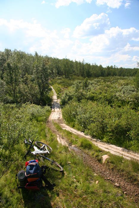 Hetta, Paavon Talo, mökki nro 14 - Reppu valmiina ja pyörä huollettuna. Täältä siirtyminen autolla Kalmakaltion Loman portille (Paavon Talon isäntä Jyri Hautamäki ajoi autoni takaisin Hettaan), ja seikkailu voi alkaa...